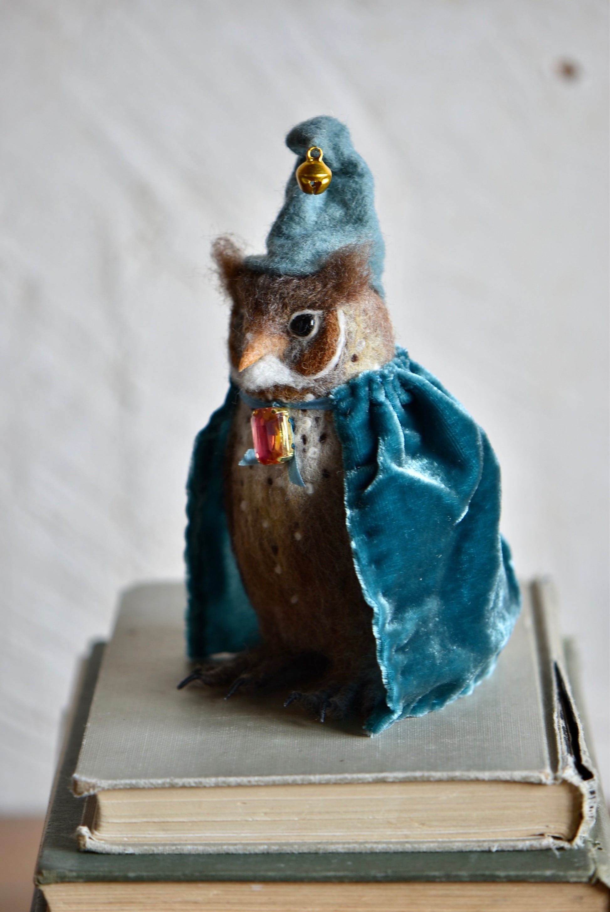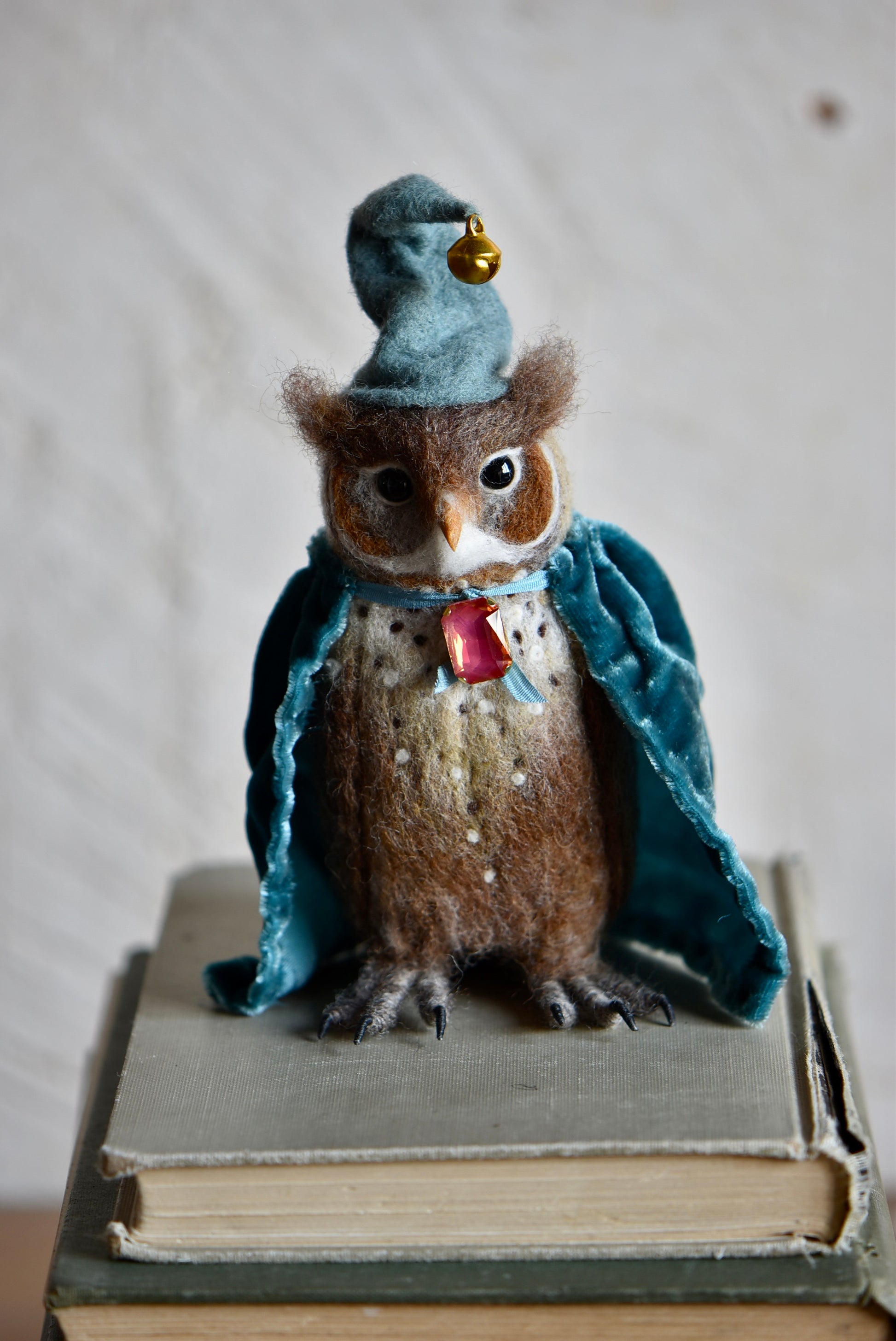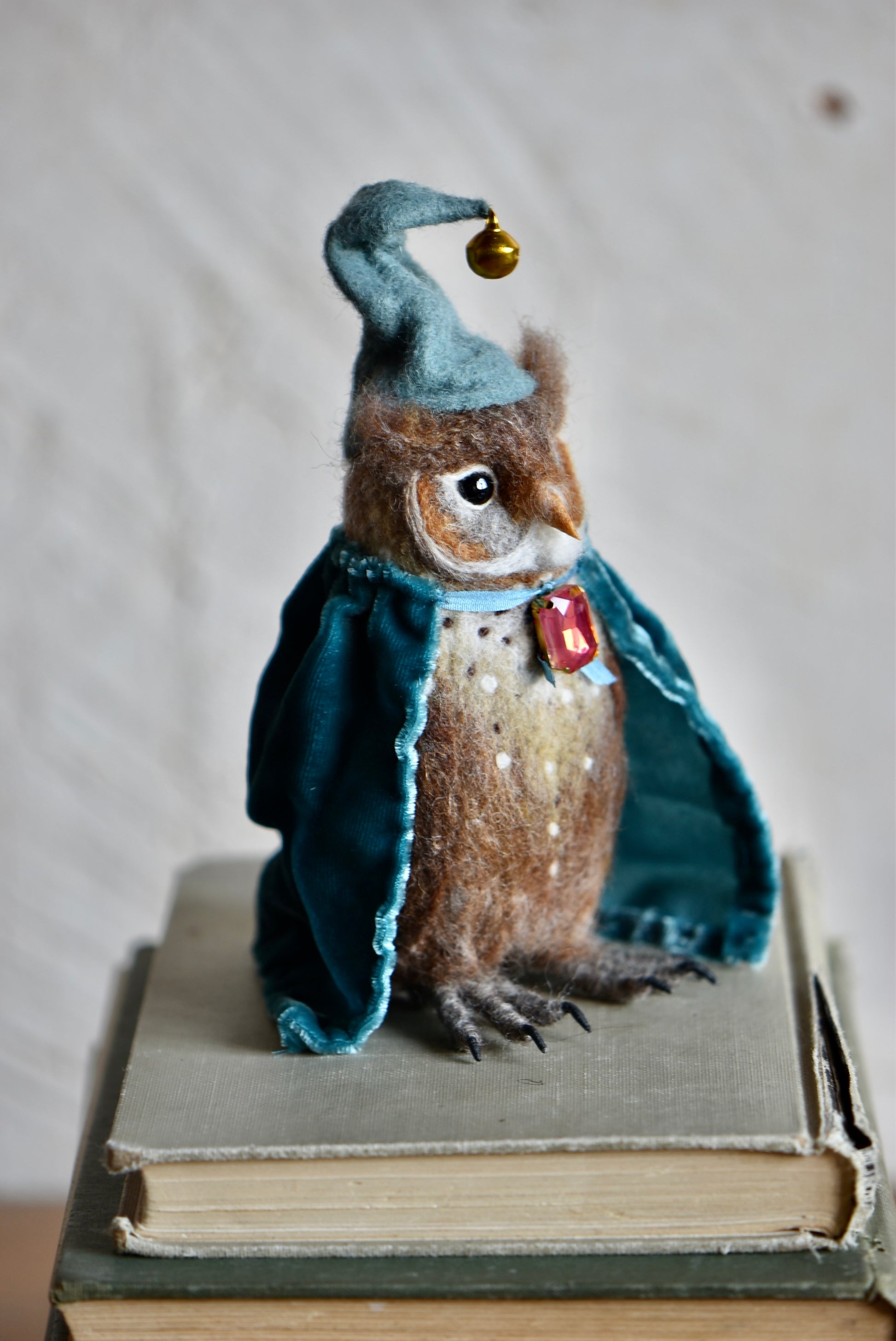 A wise felted owl in a velvet cloak and bell-tipped hat, keeper of ancient knowledge and forest magic.