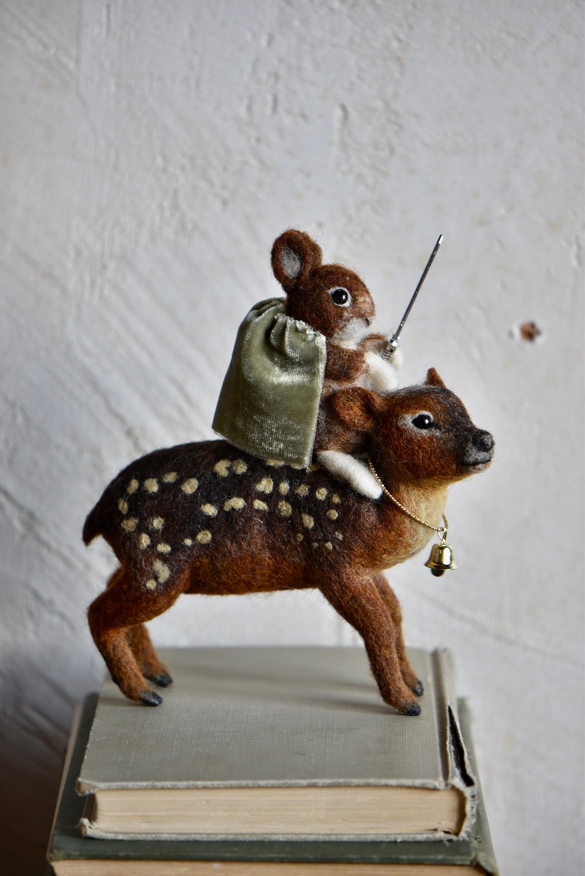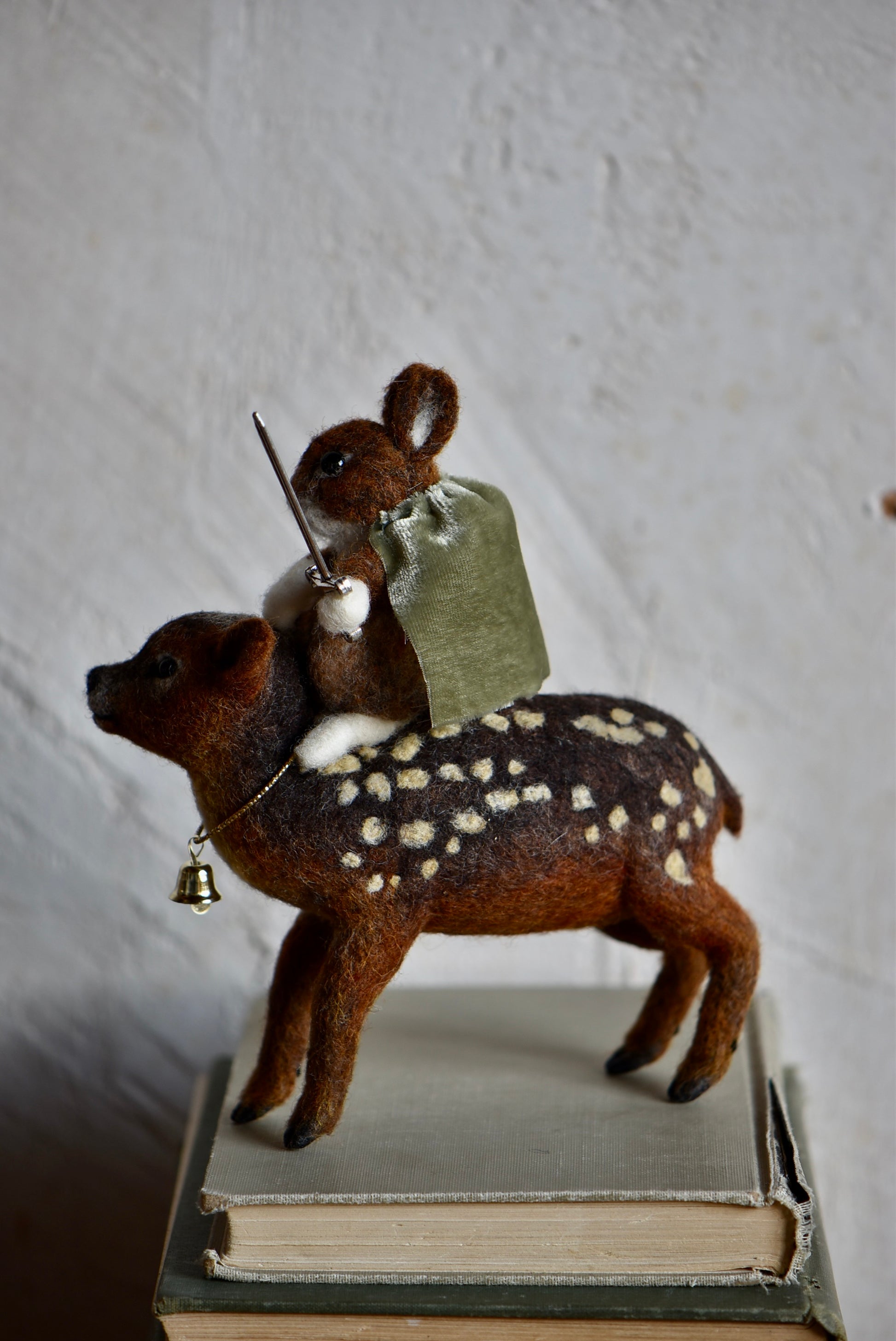 A felted rabbit rider with a green cloak atop a spotted Pudú, delivering messages through forest paths.